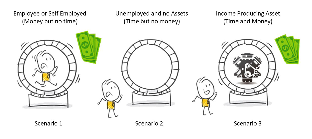 Scenario 1 is where most people are. They have to run on that hamster wheel (work a job) to bring in money. If they step off the wheel (Scenario 2), the money stops but you have time. Scenario 3 is ideal in that the asset runs the hamster wheel for you like an engine and brings in money while you still have your time.