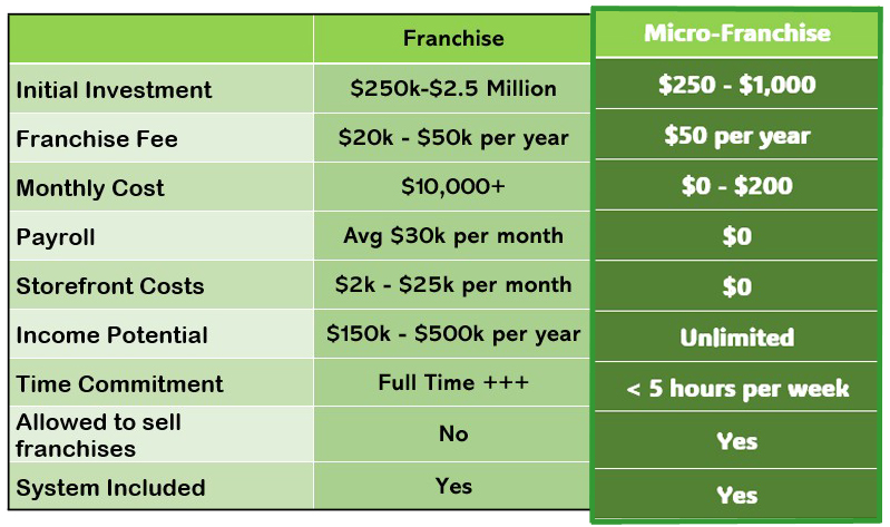 A micro franchise is a smaller eCommerce model where the established company handles the inventory, the shipping, and the systems. You do not need to pay a hefty franchise fee or buy inventory, ship product or hire employees. The company takes care of all of that. The big benefit with this program is you also have the right to sell other micro franchises. Why is that important? Because you not only make money from product sales through your micro-franchise but you will get a percentage of sales through the micro franchises that you sell. That's huge!